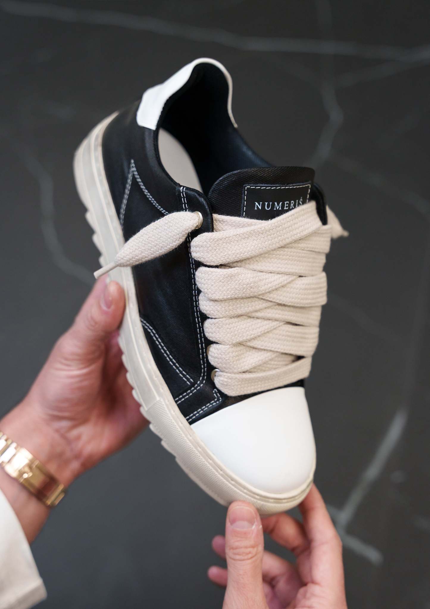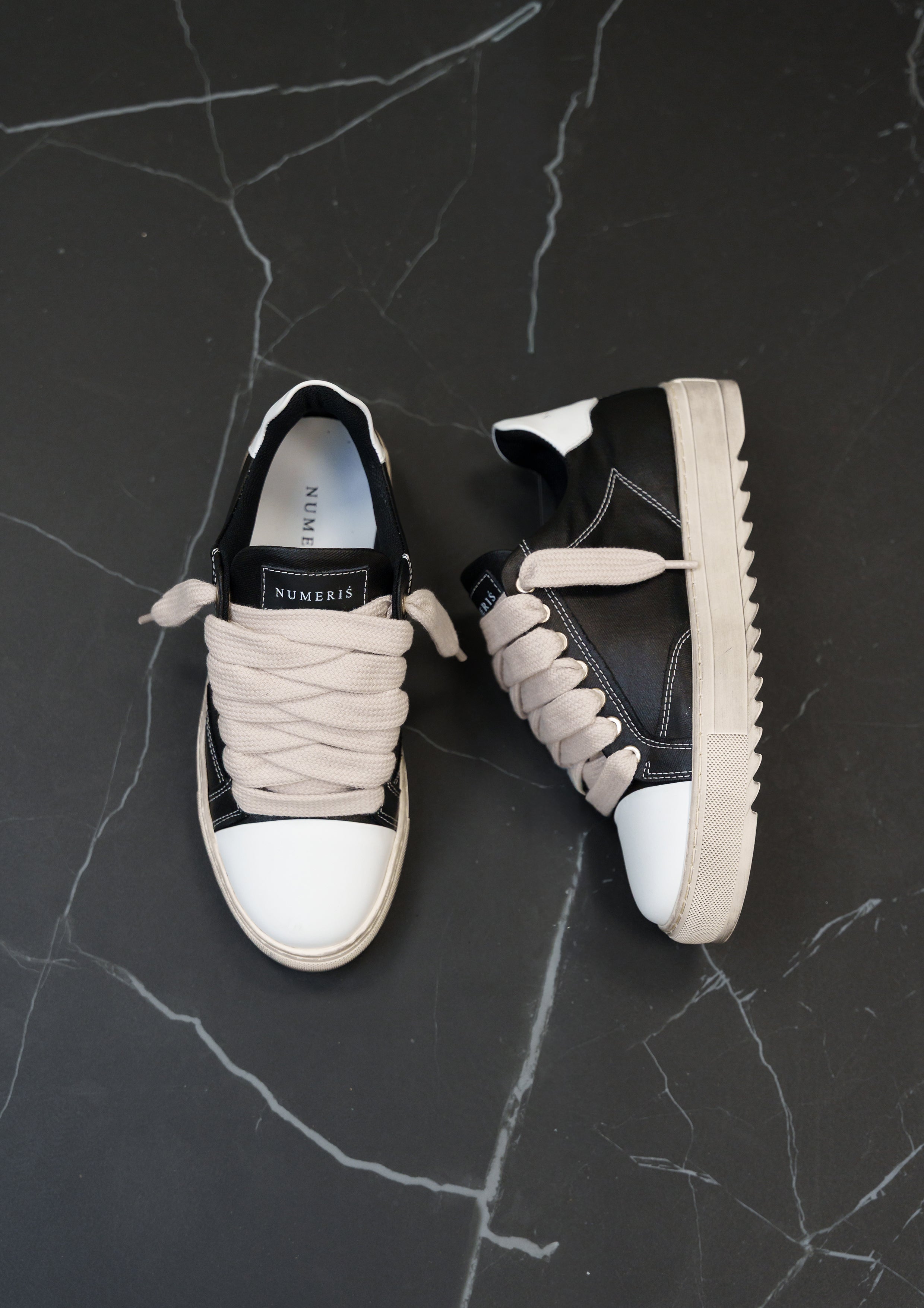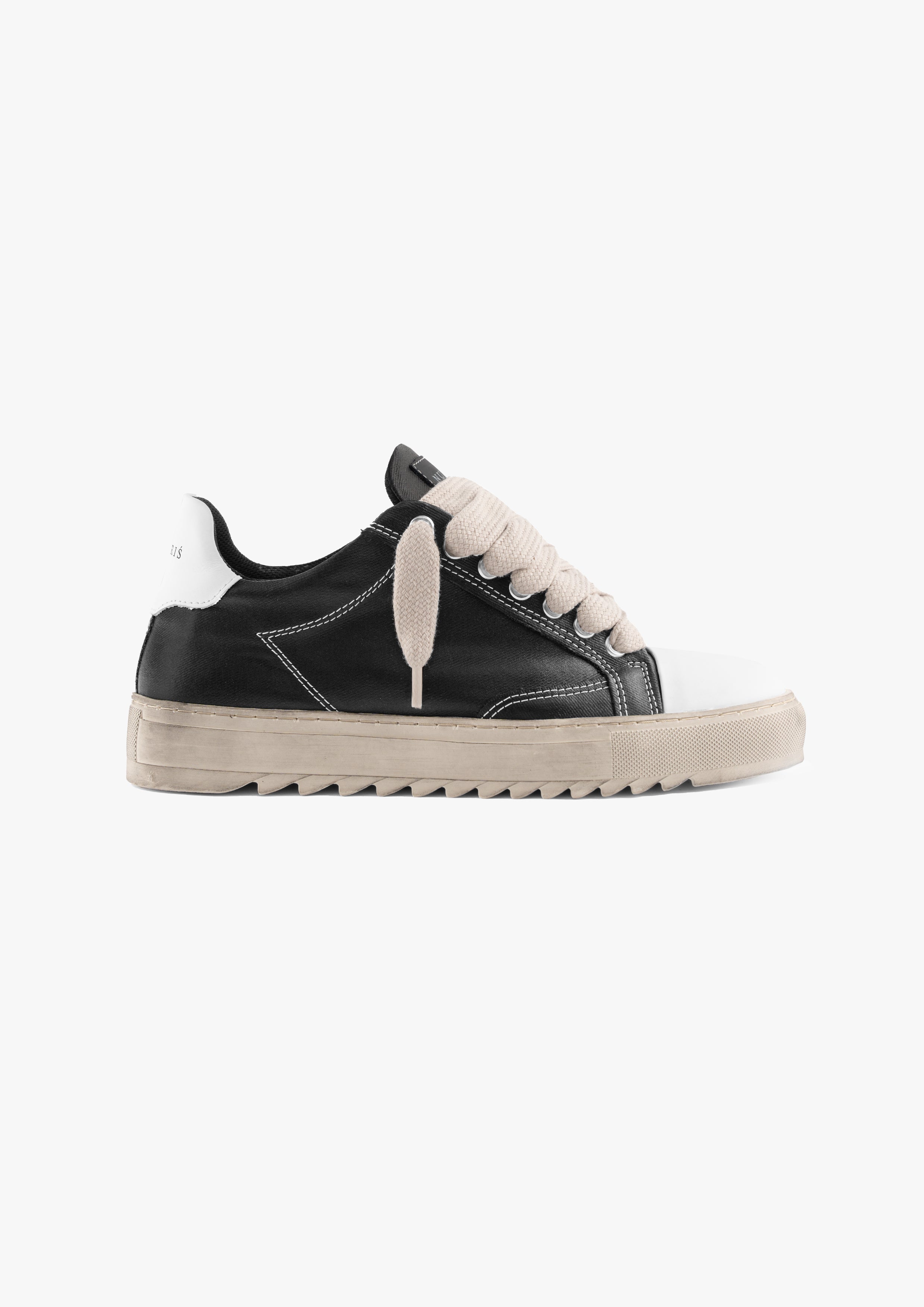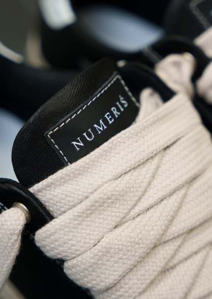This Atelier features a waxed black canvas upper with crisp white stitching and finished with our signature smooth leather white toe cap. The interior of the trainer features collar lining providing unrivalled comfort. The final touches see our Numeriś branding on the heel of the shoe.