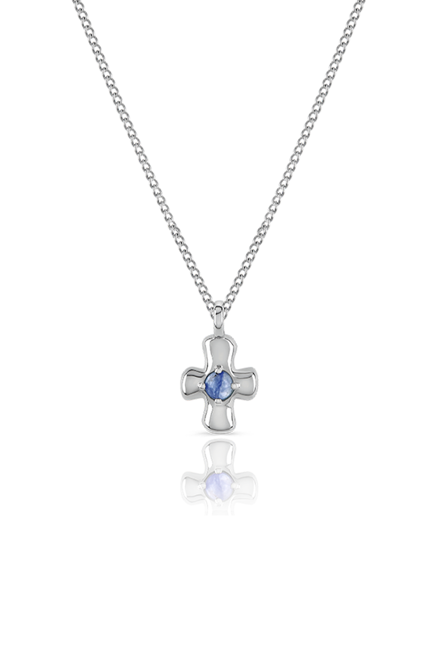 Rounded by nature, and by knowledge. Adorn your outfit with this molten cross pendant featuring a natural Blue Quartz stone.