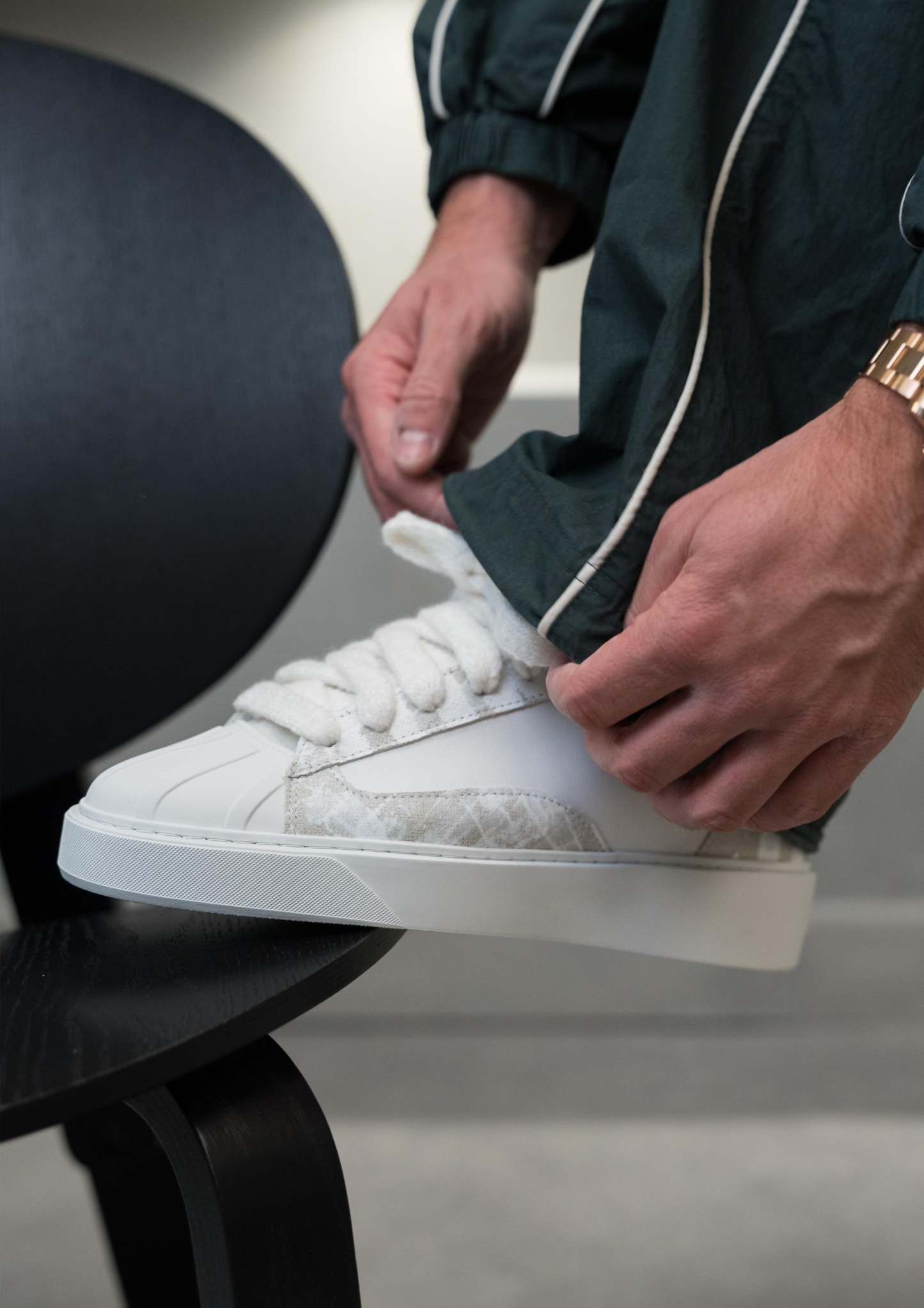 Introducing the Eclipse. Drawing quiet influence from the pared-back forms of 1960s basketball footwear, reinterpreted through a modern, sculptural lens. Its defining element, the hand-shaped rubber shell toe, has been meticulously developed over months to achieve a silhouette that balances structure with design. Designed to sit seamlessly within the flow of the upper, its curves and ridges were shaped through countless iterations to achieve a form that feels both modern and rooted in heritage.