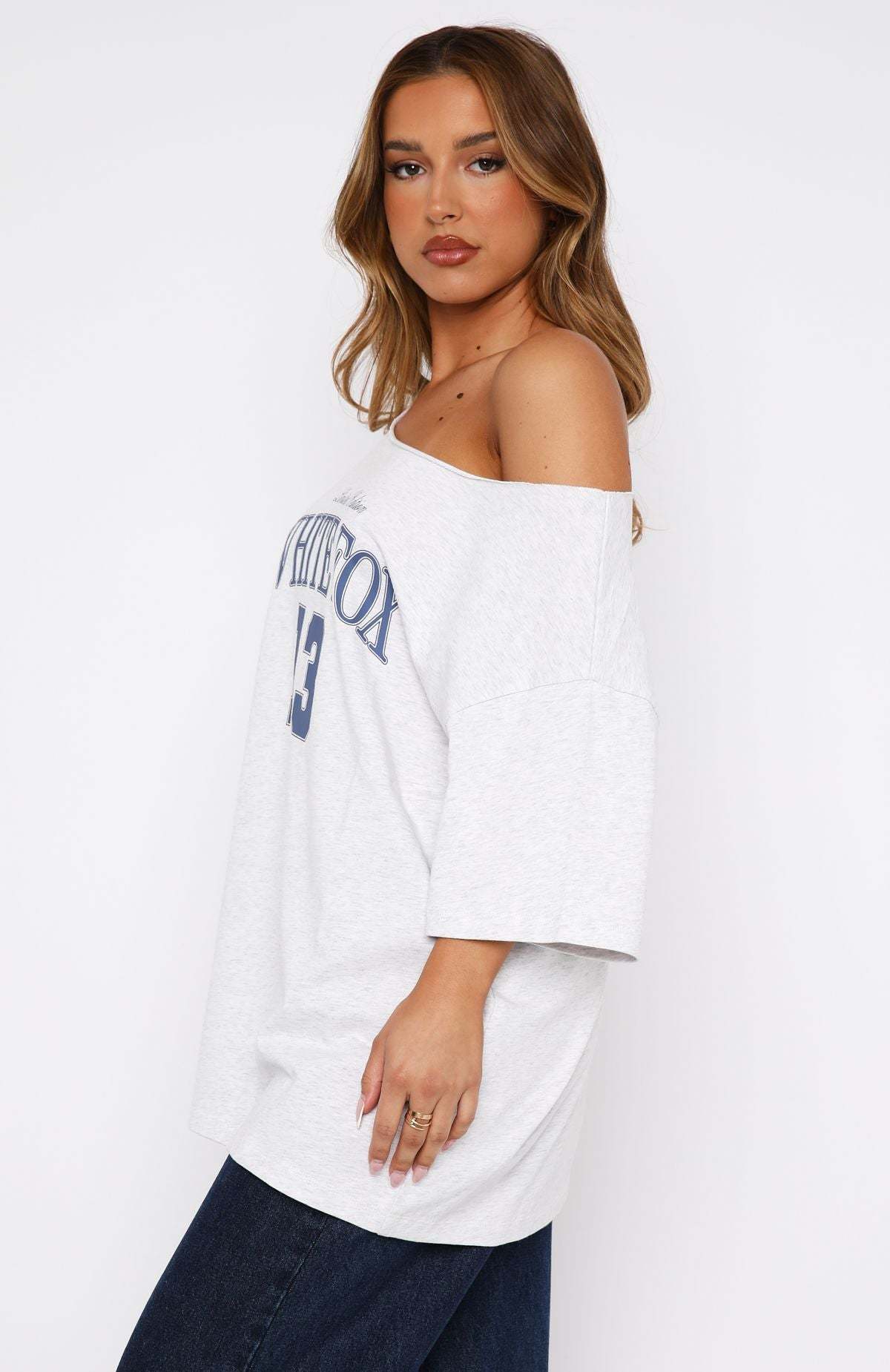 The Everything In Time Off Shoulder Oversized Tee Grey Marle features an off the shoulder design, oversized fit, slouch shoulders and printed logo design centre front. Team with a skort and your favourite sneakers for the ultimate chic and sporty look!