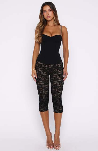Fall in love with the Vibe With Me Lace Capri Pants Black. Featuring a thin, elasticated waistband, mesh lined, slightly sheer, 3/4 length and stretch material for an easy slip on design. Pair with the matching Vibe With Me Lace Top Black or Moonlight Dance Bustier for a look we adore!