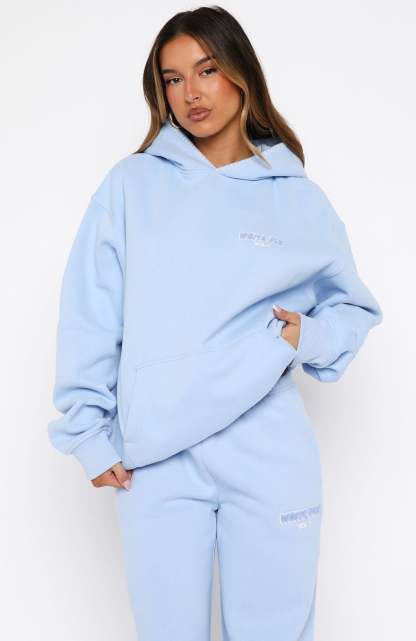Comfort is an attitude, and this set embodies it. The Vol. 1 Oversized Hoodie in Blue features a relaxed hood with exposed stitching, slouched shoulders and ribbed hems, which round out an oversized silhouette. Designed with long sleeves, a roomy front pocket, and a lined fleece interior, this hoodie delivers a cosy feel. White Fox woven text embellishes the side front and back, paired with printed "made with love" text. Style with the matching Vol. 1 Wide Leg Sweatpants Blue.